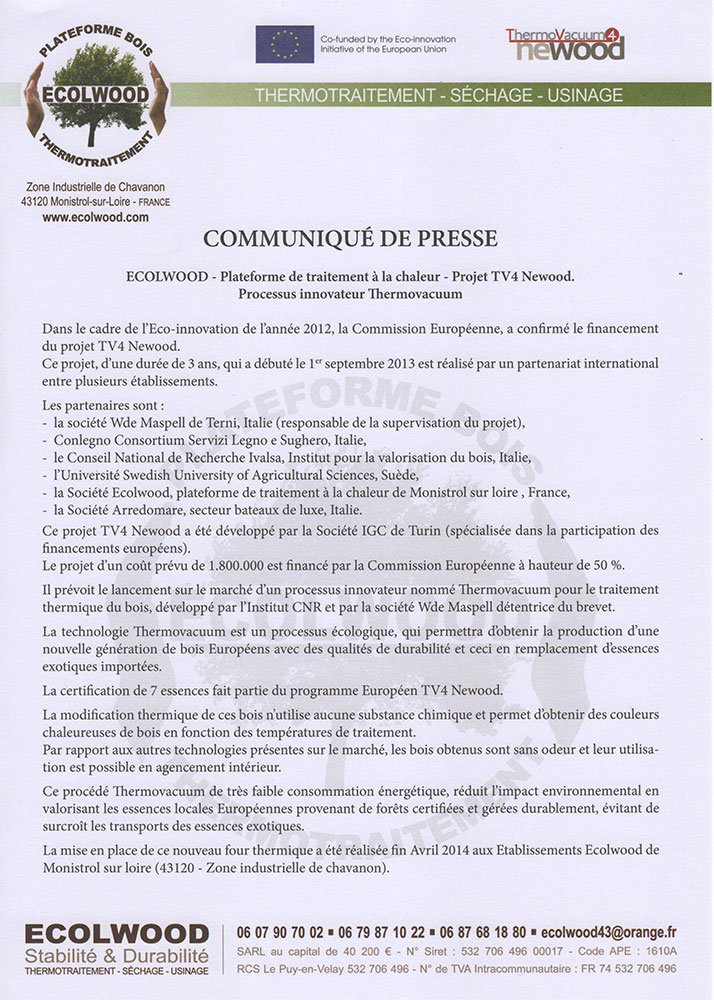 - Création d’Ecolwood® Plateforme Ecologique de thermo-traitement à façon.